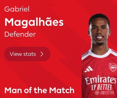 经英超官方网站球迷投票统计,加布里埃尔以42%的得票率超越赖斯(获得36%的得票率)等球员,荣获全场最佳球员荣誉。